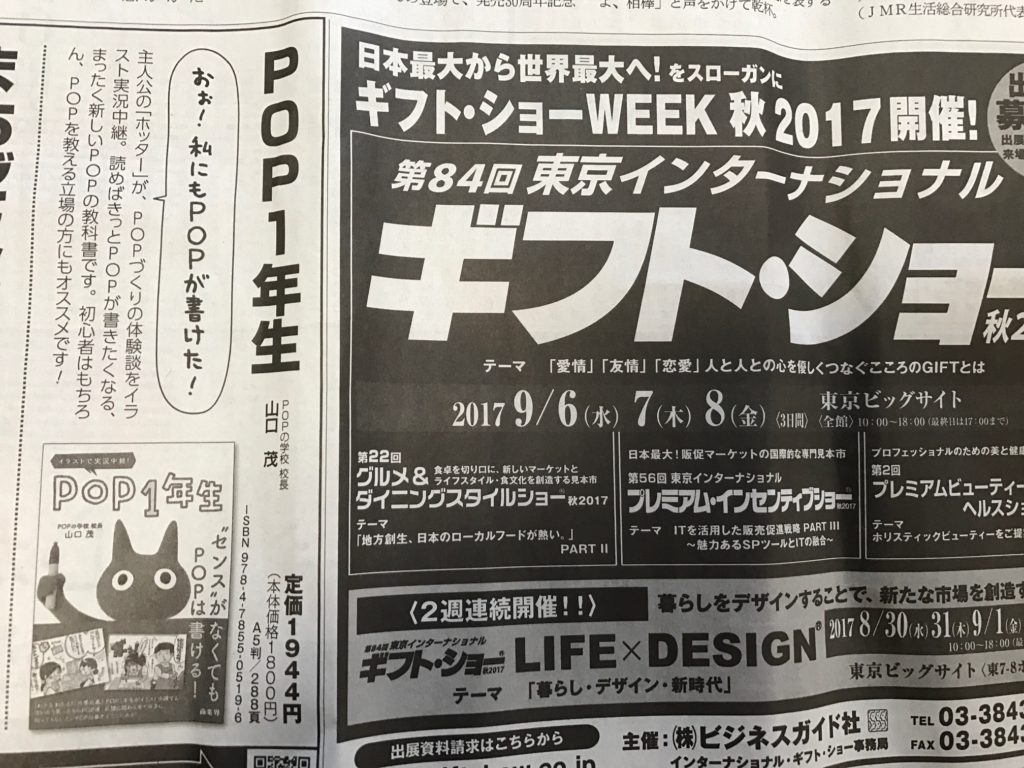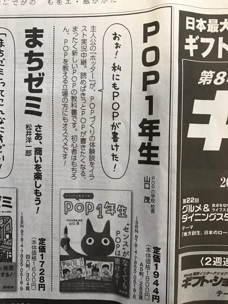 ちょっと前に商業界の方から「『POP1年生』の広告を6/19の日経MJに出します。」