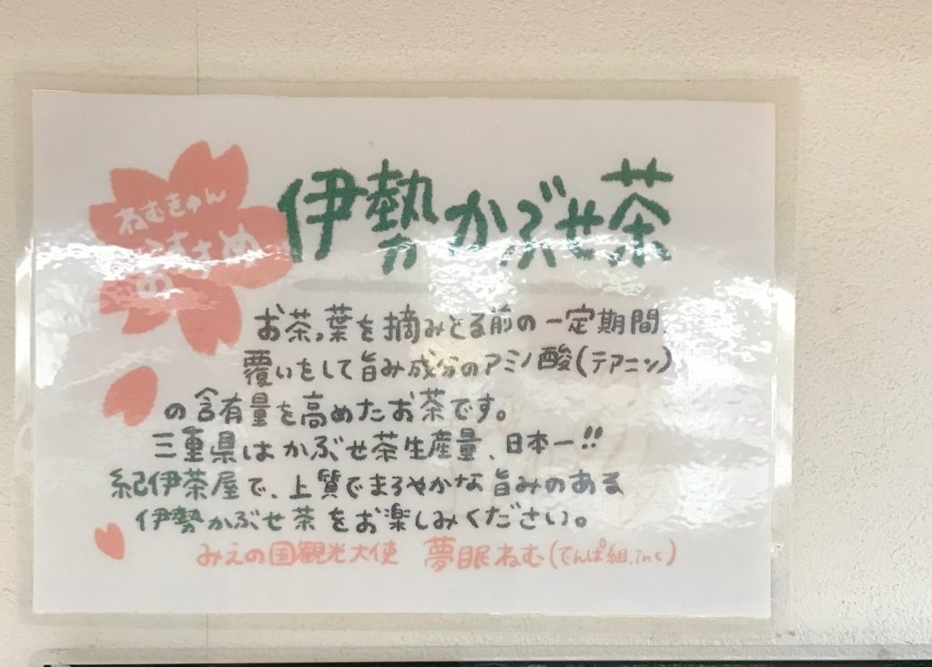 みえの国観光大使の夢眠ねむさんが書いたという「伊勢かぶせ茶」のPOPもあります。