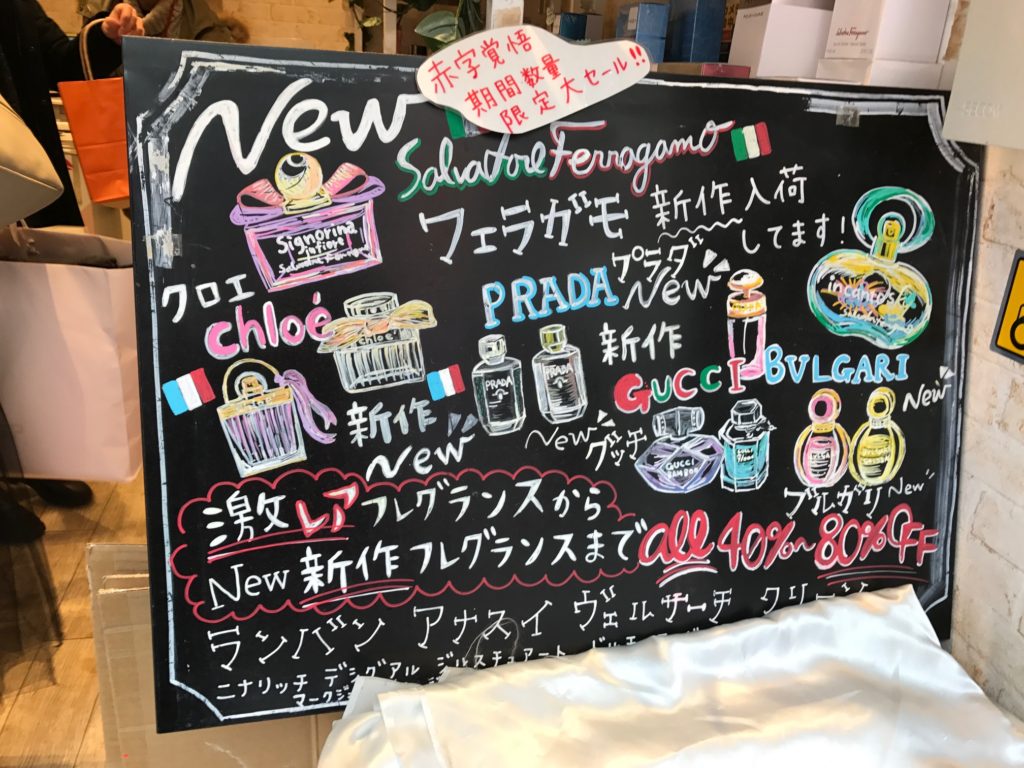 今日通りかかったフレグランスの店頭では、黒板に