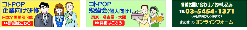 トップページコトPOPとは?コトPOP企業向け研修コトPOP勉強会(個人向け)会社案内お客様の声お問い合わせ